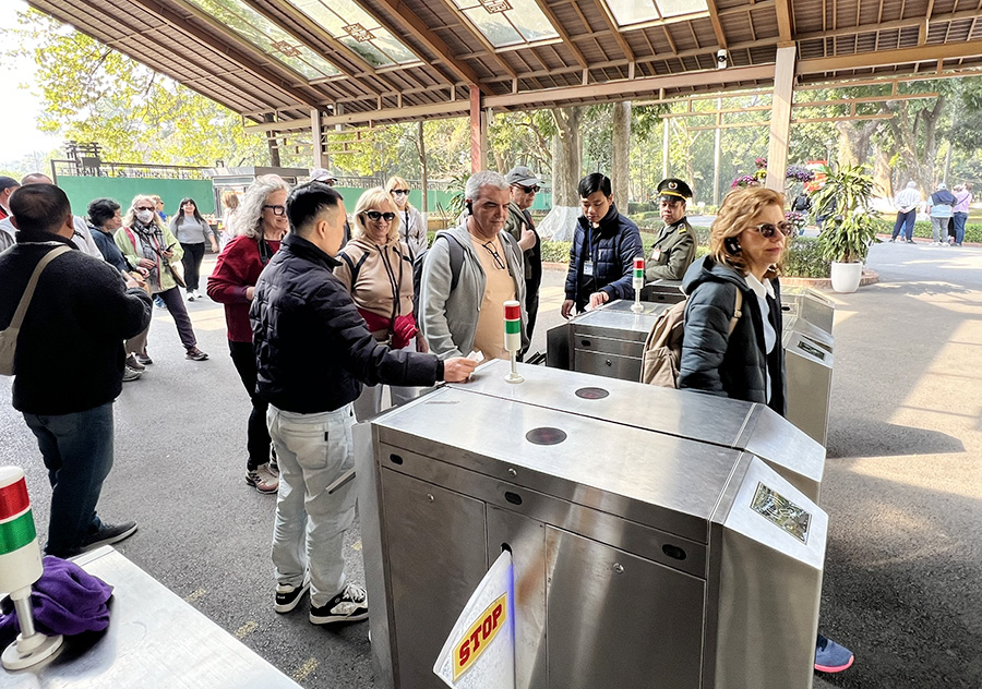 Du khách trải nghiệm Hệ thống vé điện tử tại Khu di tích Chủ tịch Hồ Chí Minh tại Phủ Chủ tịch (Ảnh: TITC)