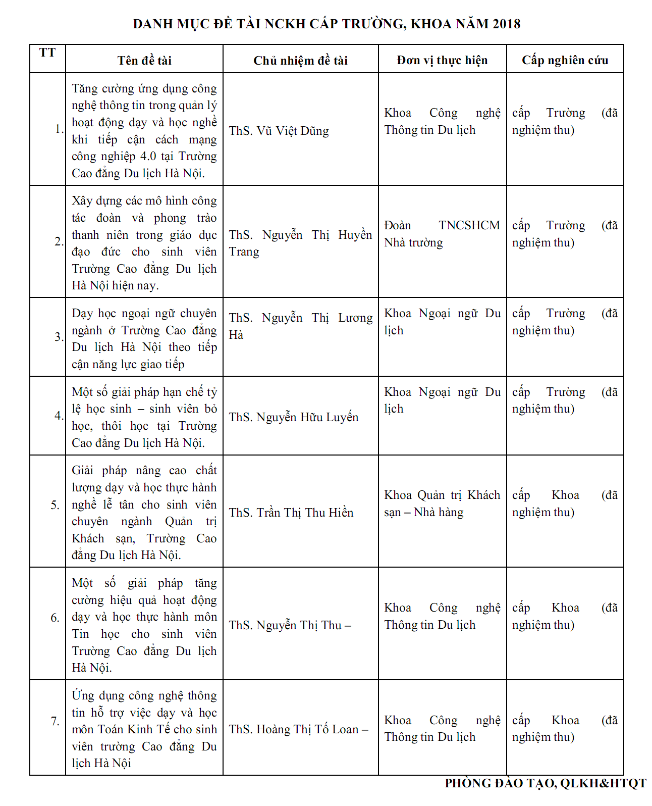 Danh mục đề tài NCKH cấp Trường, Khoa năm 2018