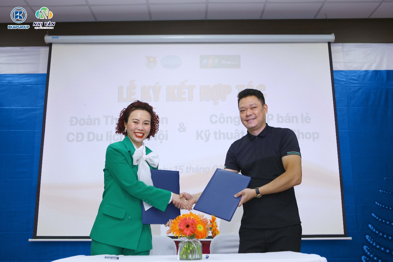 Phát biểu tại buổi lễ, đồng chí Nguyễn Thị Huyền Trang - Bí thư Đoàn Thanh niên Trường Cao đẳng Du lịch Hà Nội đã gửi lời cảm ơn tới Tập đoàn BKAP và Công ty CP bán lẻ Kỹ thuật số FPT Shop và cũng bày tỏ buổi lễ ký kết này sẽ là sự khởi đầu tốt đẹp cho các chương trình của Đoàn thanh niên sắp tới, Đoàn Trường sẽ cố gắng trong khả năng có thể để hỗ trợ cũng như truyền thông cho các đơn vị hợp tác.