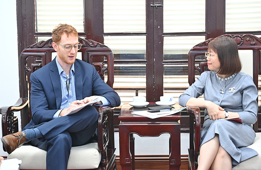 Phó Cục trưởng Cục Du lịch Quốc gia Việt Nam Nguyễn Thị Hoa Mai tiếp và làm việc với ông James Peranteau, đại diện Đại sứ quán Hoa Kỳ tại Việt Nam (Ảnh: TITC)