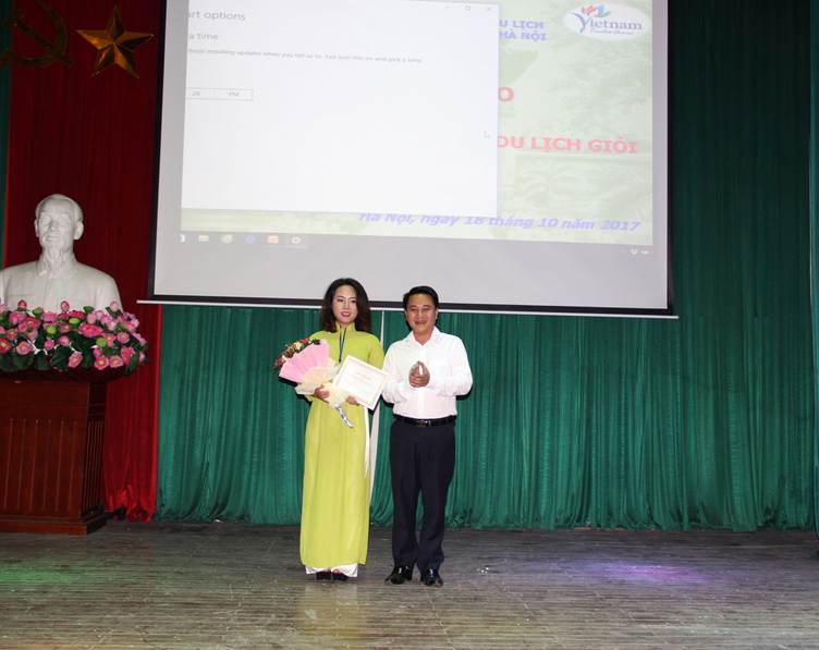 Ông Lê Hồng Thái, PGĐ công ty lữ hành Hanoitourist trao giải Thuyết minh xuất sắc (sinh viên Lưu Thị Tình lớp C13G1, nội dung Nhà sàn tại Khu Di tích Chủ tịch Hồ Chí Minh tại Phủ Chủ tịch)