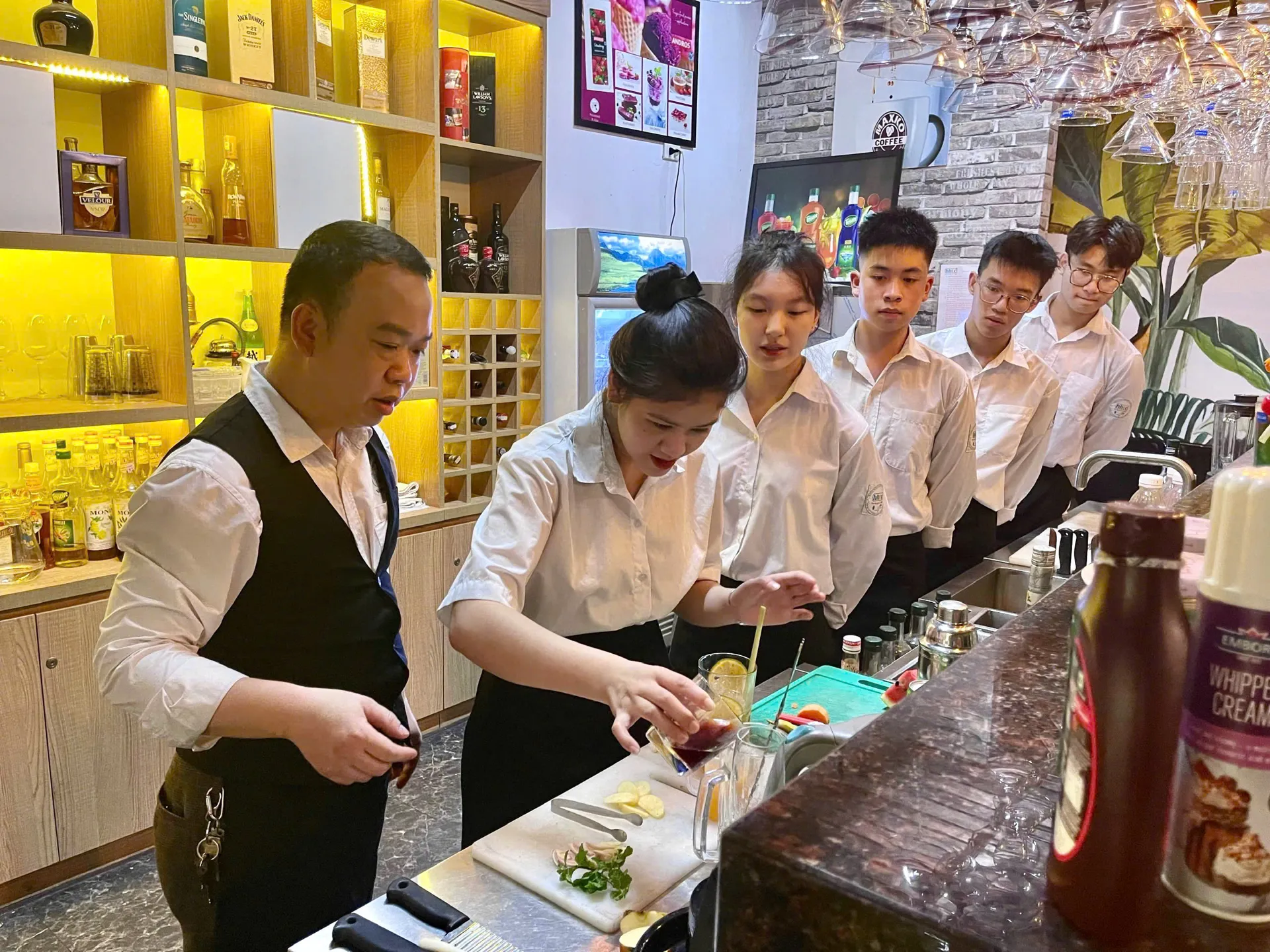 Học sinh Trường Trung cấp Du lịch Hà Nội thực hành pha chế đồ uống. Ảnh: Trần Oanh