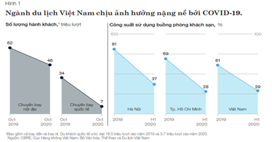 Kể từ tháng 02/2020, đại dịch Covid-19 bùng phát trên thế giới đã ảnh hưởng nghiêm trọng đến ngành du lịch, trong đó ngành du lịch Việt Nam. Theo kết quả tổng hơp từ Tổng cục Thống kê (2021), khoảng thời gian từ tháng 3 đến hết năm 2020, Việt Nam không mở cửa du lịch quốc tế, ngành du lịch đối mặt với những khó khăn chưa từng xảy ra trước đó. Số lượt khách quốc tế đến Việt Nam cả năm 2020 chỉ đạt 3,8 triệu lượt người, giảm khoảng 80% so với năm trước (Hình 1), trong đó hơn 96% là khách quốc tế đến trong quý I/2020; từ quý II đến nay chủ yếu là các chuyên gia, lao động kỹ thuật nước ngoài làm việc tại các dự án ở Việt Nam.Theo nghiên cứu phân tích của McKinsey (2021), du lịch quốc tế, nguồn thu chính của ngành du lịch, đã bị sụt giảm mạnh trong năm vừa qua, công suất buồng phòng của khách sạn cũng chỉ đạt 30%.