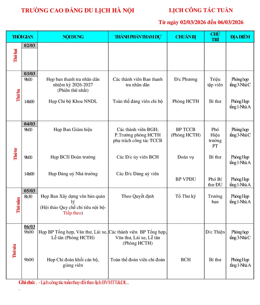 Lịch công tác tuần từ ngày 02/3 - 06/3/2026