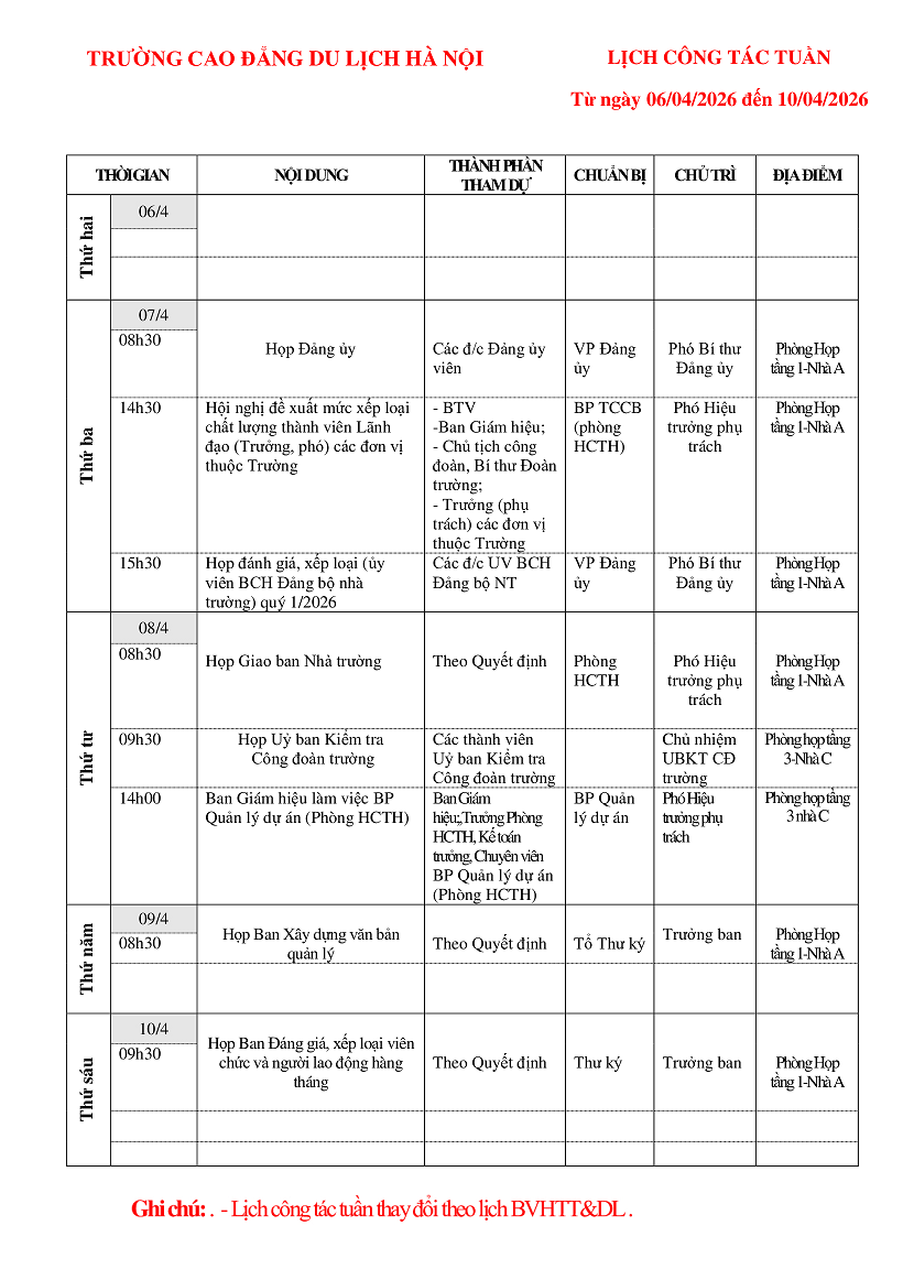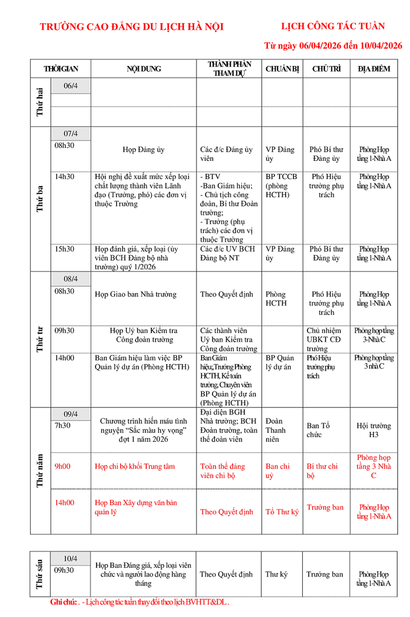 Lịch công tác tuần từ ngày 06/4 - 10/4/2026