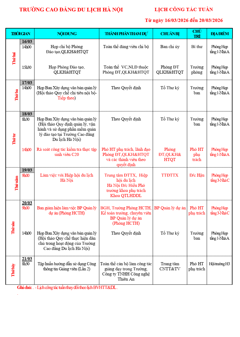Lịch công tác tuần từ ngày 16/3 - 20/3/2026