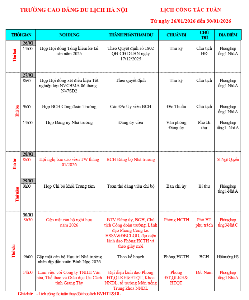 Lịch công tác tuần từ ngày 26/1 - 30/1/2026