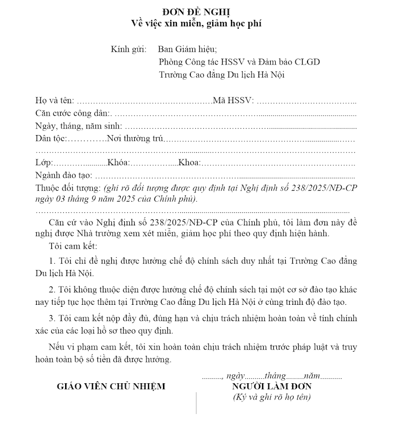 Mẫu 1 Miễn giảm học phí 2025