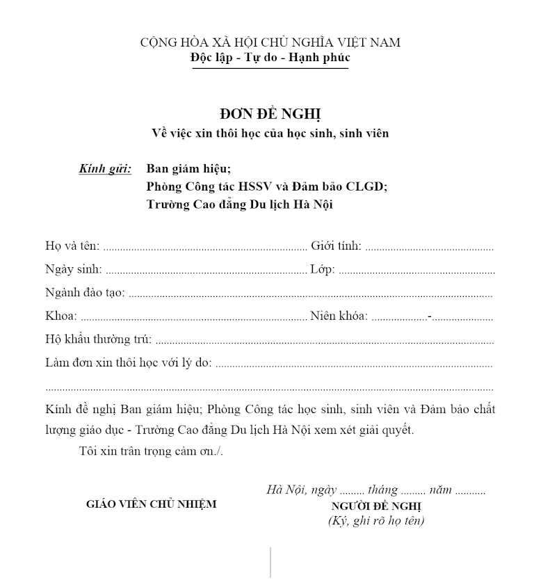 Mẫu đơn đề nghị thủ tục hành chính của HSSV
