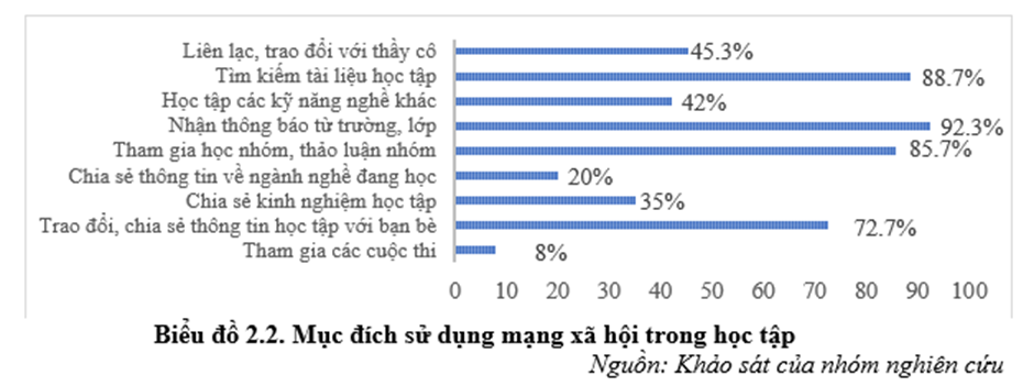 Nhóm nghiên cứu tiến hành khảo sát 330 sinh viên của trường Cao đẳng Du lịch Hà Nội và 100% sinh viên trả lời có sử dụng mạng xã hội. Qua mạng xã hội, sinh viên có thể tìm kiếm thông tin, liên lạc, chia sẻ cảm xúc, trao đổi, bàn bạc, buôn bán, học tập… Như vậy, sinh viên có thể khai thác và sử dụng mạng xã hội với nhiều mục đích khác nhau.