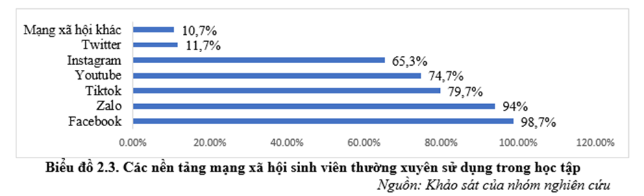 Khi sử dụng mạng xã hội trong học tập, sinh viên trường Cao đẳng Du lịch Hà Nội chủ yếu dùng những loại mạng xã hội họ sử dụng thường xuyên trong cuộc sống. Biểu đồ 2.3. đã cho thấy Facebook là mạng xã hội được các bạn sinh viên sử dụng nhiều nhất, chiếm 98,7%. Tiếp theo là mạng xã hội Zalo chiếm 94%. Do yêu cầu của hoạt động học tập, sinh viên thường phải nhận thông báo từ trường, lớp; tham gia học nhóm, làm việc nhóm; trao đổi liên lạc với thầy cô nên Zalo là một mạng xã hội được họ sử dụng đáp ứng các yêu cầu trên. Tiktok chiếm 79,7% là mạng xã hội đứng thứ 3 được đông đảo sinh viên sử dụng cho mục đích học tập. Ngoài ra, sinh viên còn có xu hướng lựa chọn các mạng xã hội như Youtube, Instagram phục vụ cho học tập. Ngoài những mạng xã hội được sinh viên sử dụng chủ yếu thì cũng còn nhiều mạng xã hội có tỷ lệ sinh viên sử dụng không cao (Twitter, Viber, Zingme…), điều này có thể giải thích thông qua việc ngày càng có nhiều mạng xã hội và sinh viên chỉ biết đến những mạng xã hội phổ biến mà bỏ qua các mạng xã hội khác.