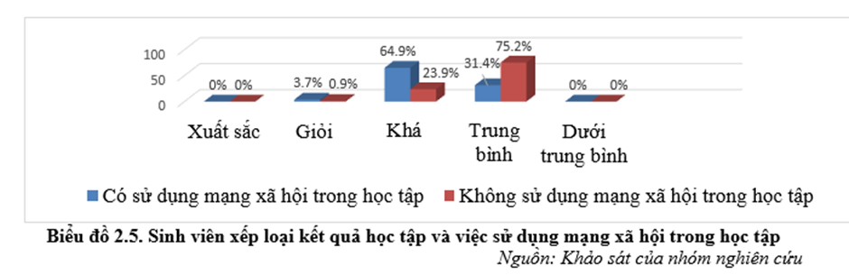 Qua biểu đồ 2.5 ta thấy có 3,7% sinh viên đạt loại giỏi có sử dụng mạng xã hội cho mục đích học tập so với 0,9% không sử dụng mạng xã hội cho học tập; có tới 64,9% sinh viên sử dụng mạng xã hội cho học tập đạt kết quả khá so với 23,9% không sử dụng mạng xã hội cho mục đích học tập. Thậm chí khi sinh viên không sử dụng mạng xã hội cho mục đích học tập thì số lượng sinh viên đạt kết quả trung bình lên tới 75,2%.