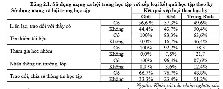 Kết quả học tập của sinh viên bị ảnh hưởng bởi rất nhiều các yếu tố. Một trong những yếu tố đó là động cơ, mục đích học tập và phương pháp học tập của sinh viên. Học tập qua mạng xã hội cũng là một trong các phương pháp học tập được nhiều sinh viên lựa chọn hiện nay. Do vậy, mục đích sử dụng mạng xã hội trong học tập của sinh viên cũng có một phần ảnh hưởng đến kết quả học tập của sinh viên. Từ bảng 2.1 ta có thể thấy rằng sinh viên trường Cao đẳng Du lịch Hà Nội có điểm trung bình chung học kỳ đạt học lực khá, giỏi có tỷ lệ sử dụng mạng xã hội với các mục đích học tập tìm kiếm tài liệu, tham gia học nhóm, trao đổi chia sẻ thông tin học tập nhiều hơn so với sinh viên không sử dụng mạng xã hội cho mục đích này (100% sinh viên đạt học lực giỏi, 83,3% đạt học lực khá khi sử dụng mạng xã hội cho mục đích tìm kiếm tài liệu; 100% sinh viên đạt học lực giỏi, 92,2% đạt học lực khá khi sử dụng mạng xã hội để tham gia học nhóm, làm việc nhóm).