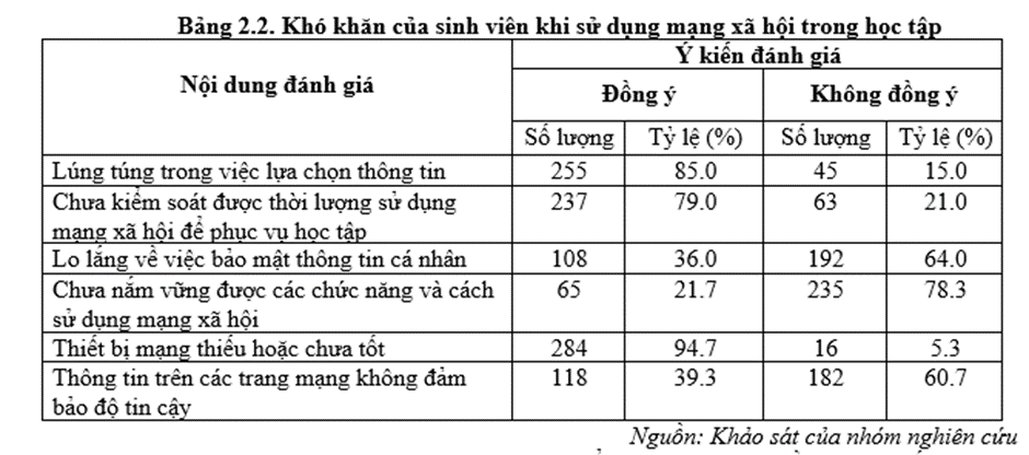 - Sinh viên còn gặp khó khăn trong việc kiểm soát thời lượng sử dụng mạng xã hội nói chung và dành cho học tập nói riêng. Đồng thời việc sử dụng mạng xã hội cho học tập của sinh viên vẫn còn mang tính thụ động. Chủ yếu do yêu cầu của Nhà trường, giáo viên hoặc các bài học cụ thể sinh viên mới tiến hành lên mạng xã hội để tìm kiếm thông tin, tài liệu, tương tác chia sẻ kinh nghiệm học tập…