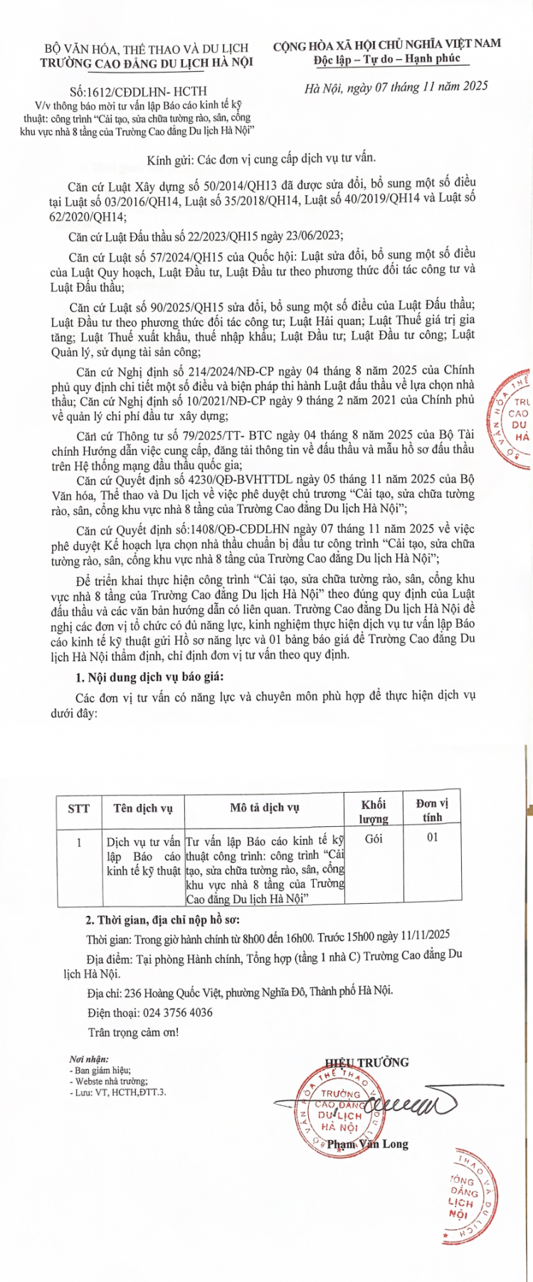 Thông báo số 1612/CĐDLHN-HCTH ngày 07/11/2025 V/v mời tư vấn lập BCKTKT công trình "Cải tạo, sửa chữa tường rào, sân, cổng khu vực nhà 8 tầng của Trường"