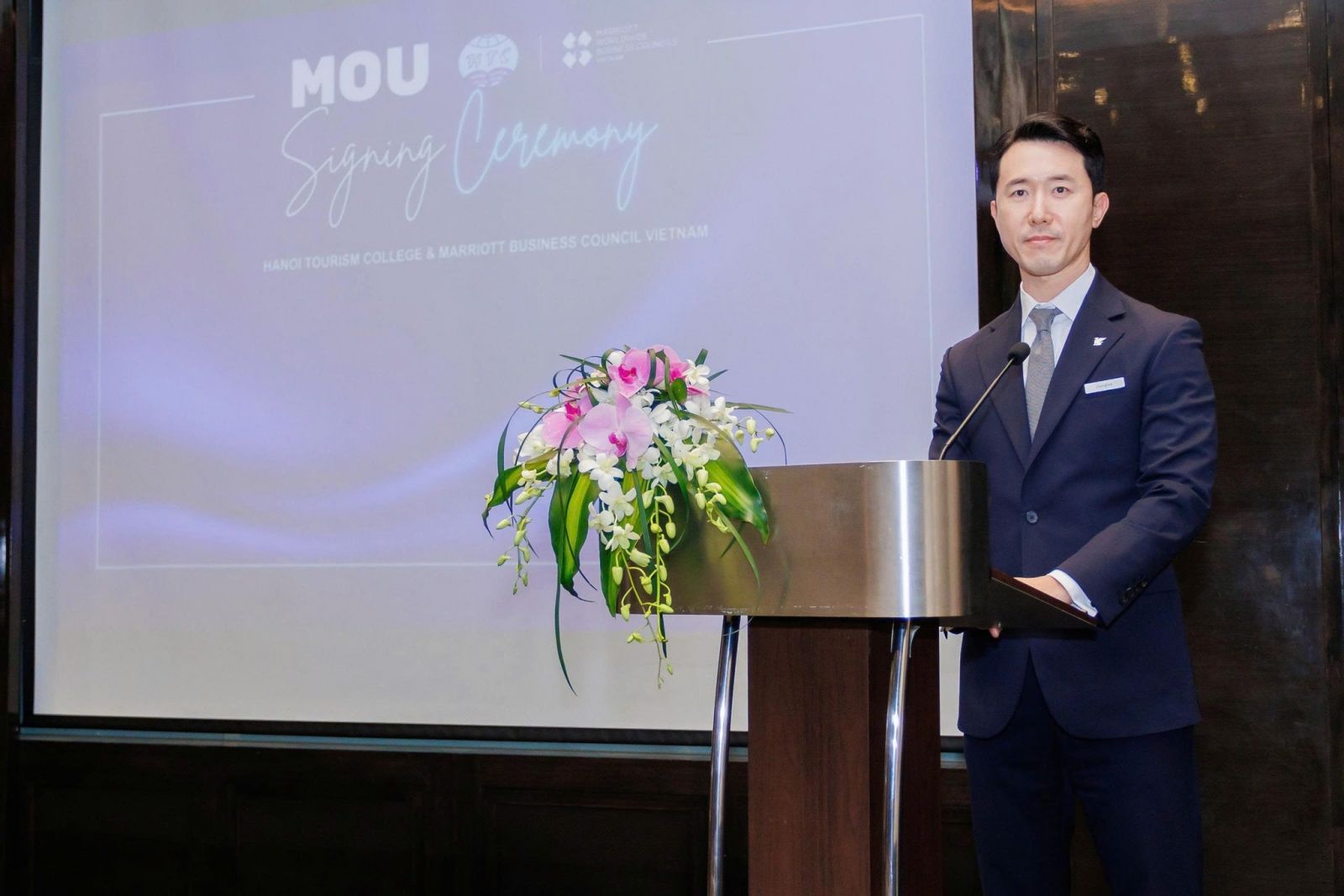 Ông Douglas Kim – Tổng Giám đốc JW Marriott Hotel Hanoi phát biểu tại lễ ký kết, khẳng định cam kết đồng hành cùng Nhà trường trong phát triển nguồn nhân lực du lịch – khách sạn chất lượng cao.