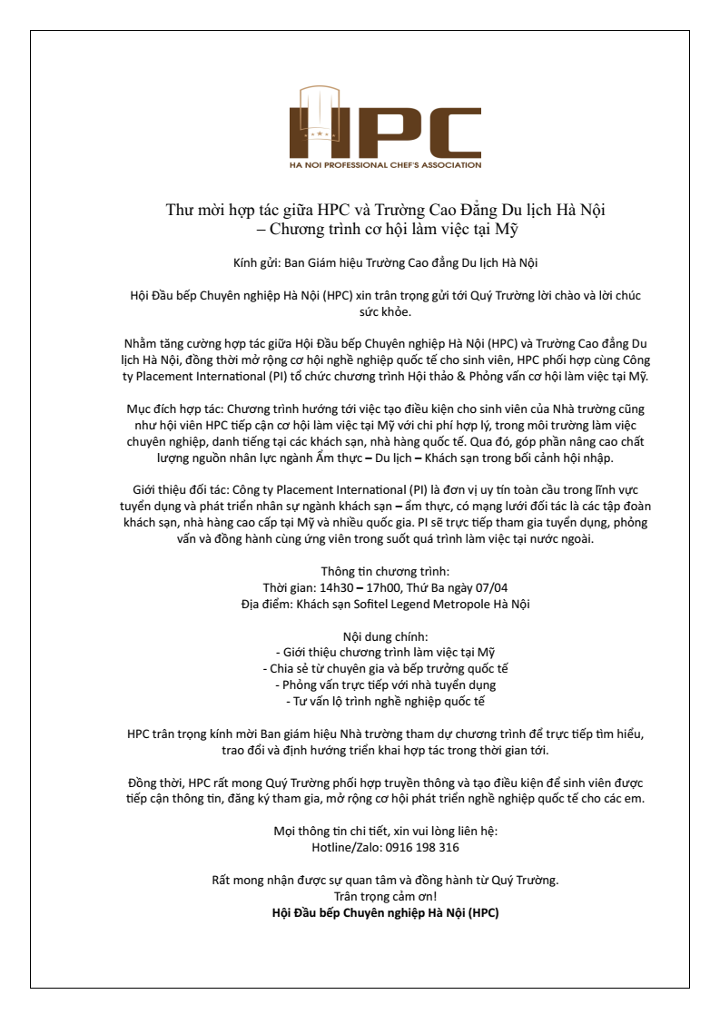 Thư mời hợp tác giữa HPC và Trường Cao Đẳng Du lịch Hà Nội – Chương trình cơ hội làm việc tại Mỹ