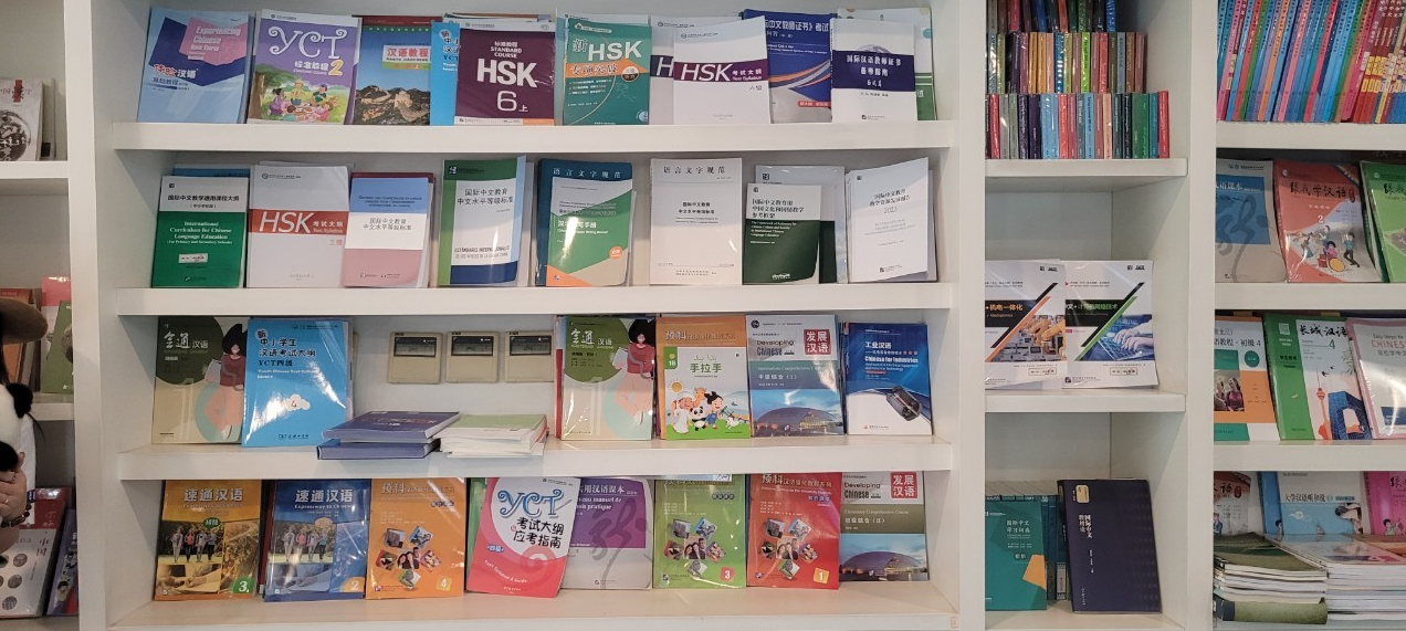Một trong các giá sách được trưng bày tại Trung tâm hợp tác giao lưu ngôn ngữ quốc tế Trung Quốc