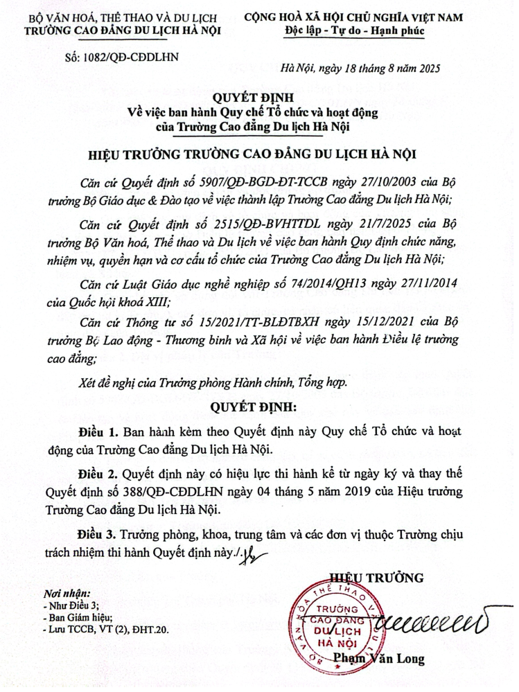Hiệu trưởng là người đại diện theo pháp luật của Trường; điều hành tổ chức và hoạt động của Trường; chịu trách nhiệm về các hoạt động của Trường theo quy định của pháp luật, Điều lệ trường Cao đẳng, Quy chế tổ chức và hoạt động của Trường và các quy định khác của Trường.