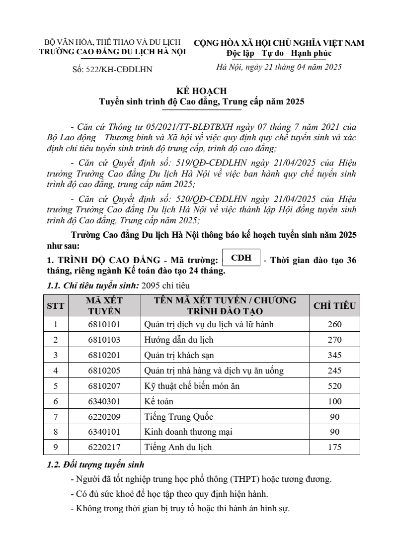 (Cập nhật thường xuyên) Trường Cao đẳng Du lịch Hà Nội trân trọng thông báo Điểm trúng tuyển và danh sách thí sinh trúng tuyển trình độ Cao đẳng, Trung cấp, chương trình song bằng (học chương trình GDTX cấp THPT kết hợp học chương trình Trung cấp) như sau: