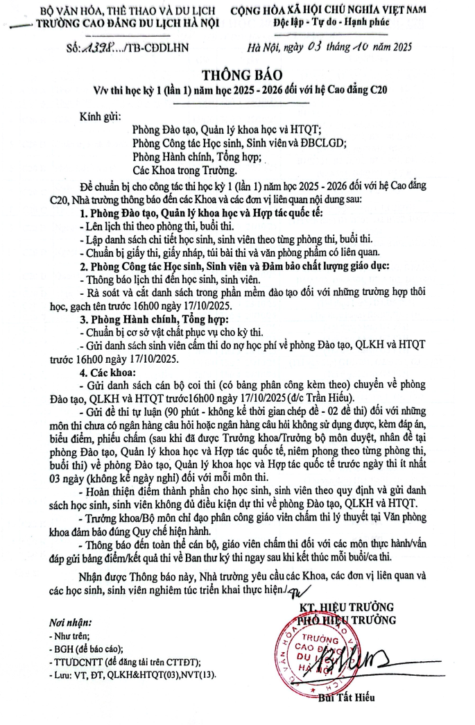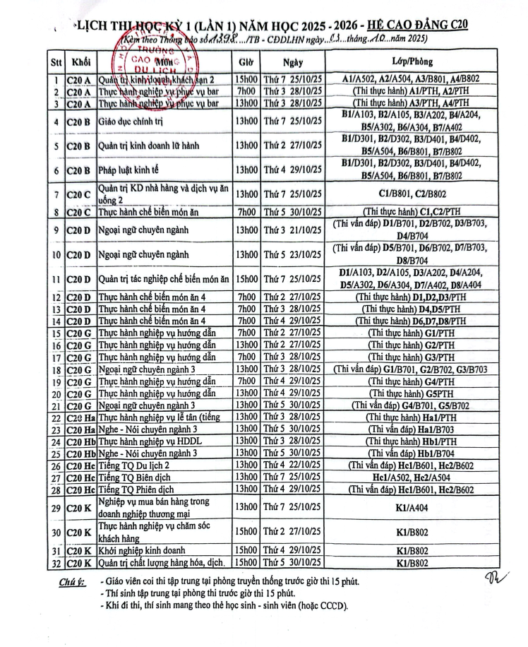 Thông báo V/v thi học kỳ 1 (lần 1) năm học 2025 - 2026 đối với hệ Cao đẳng C20