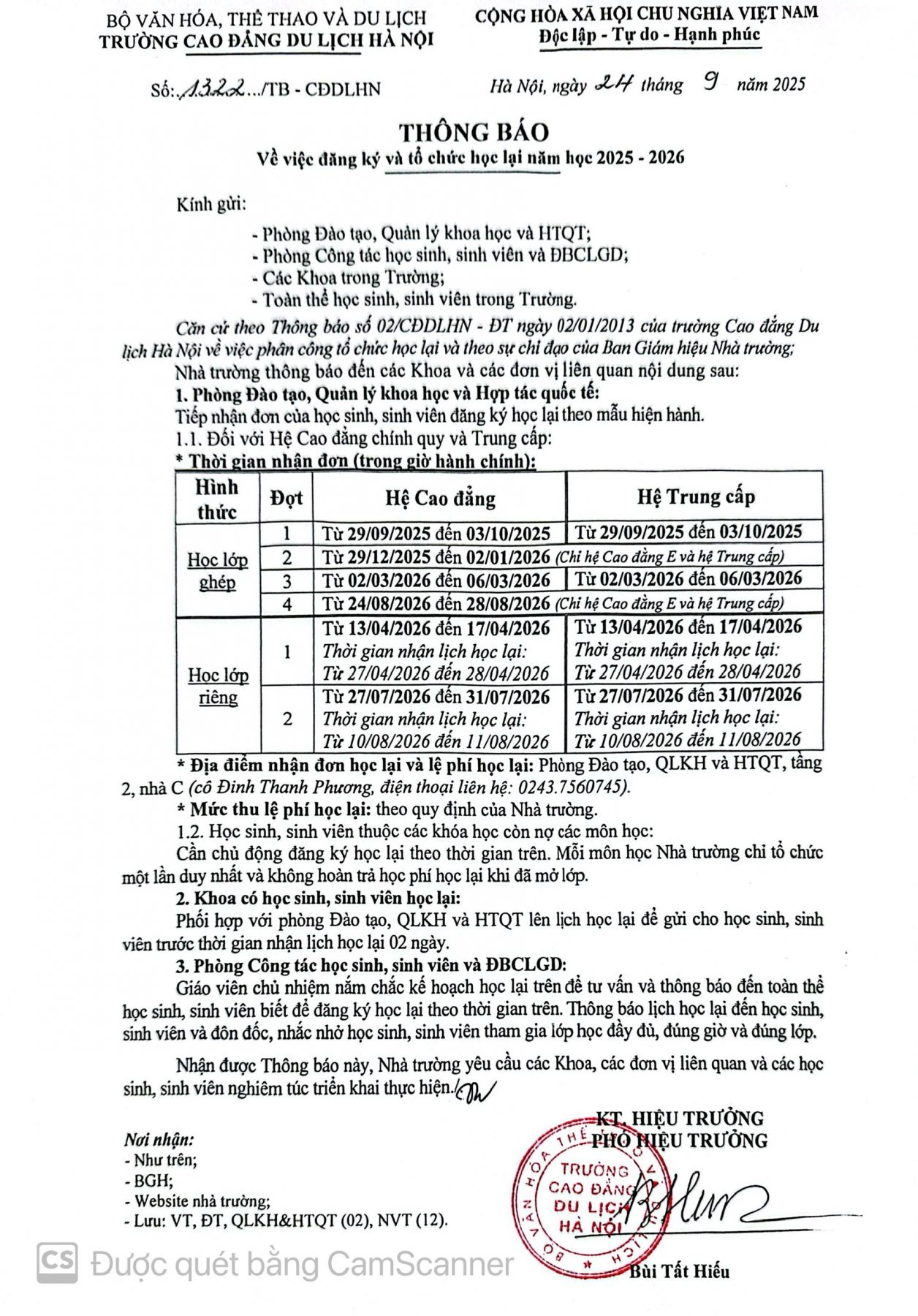 Thông báo số 1322/TB-CĐDLHN ngày 24/9/2025 về việc đăng ký và tổ chức học lại năm học 2025 - 2026