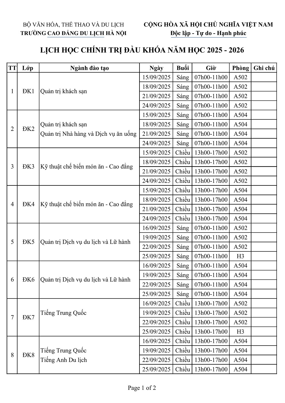 Lịch học chính trị đầu khóa năm học 2025 - 2026