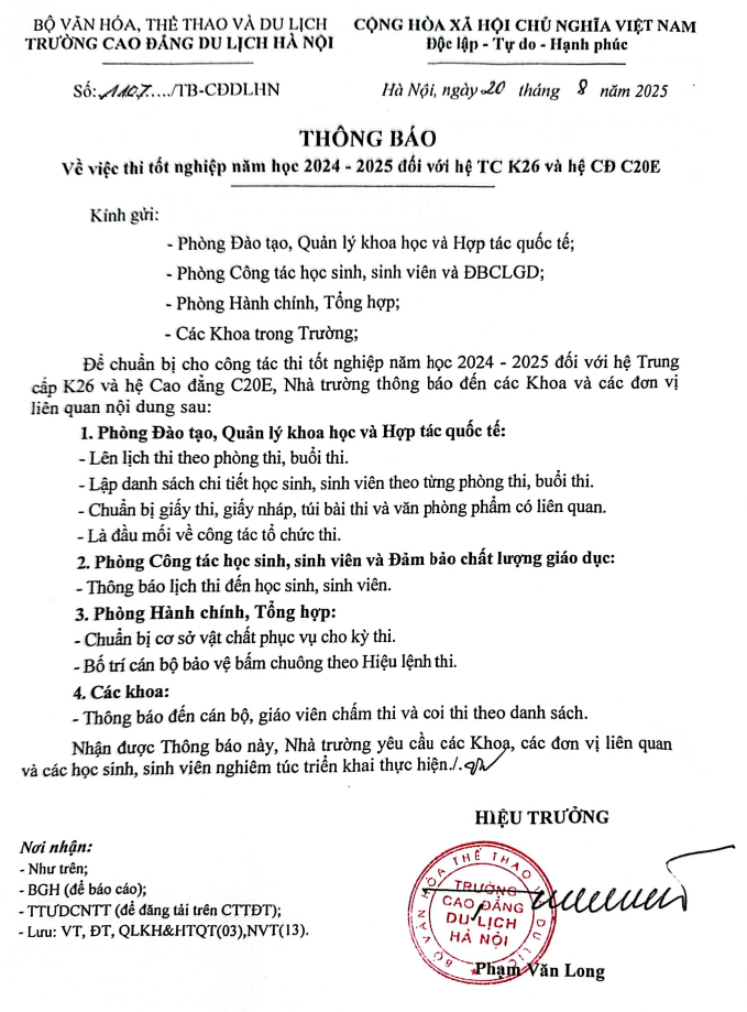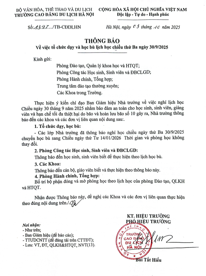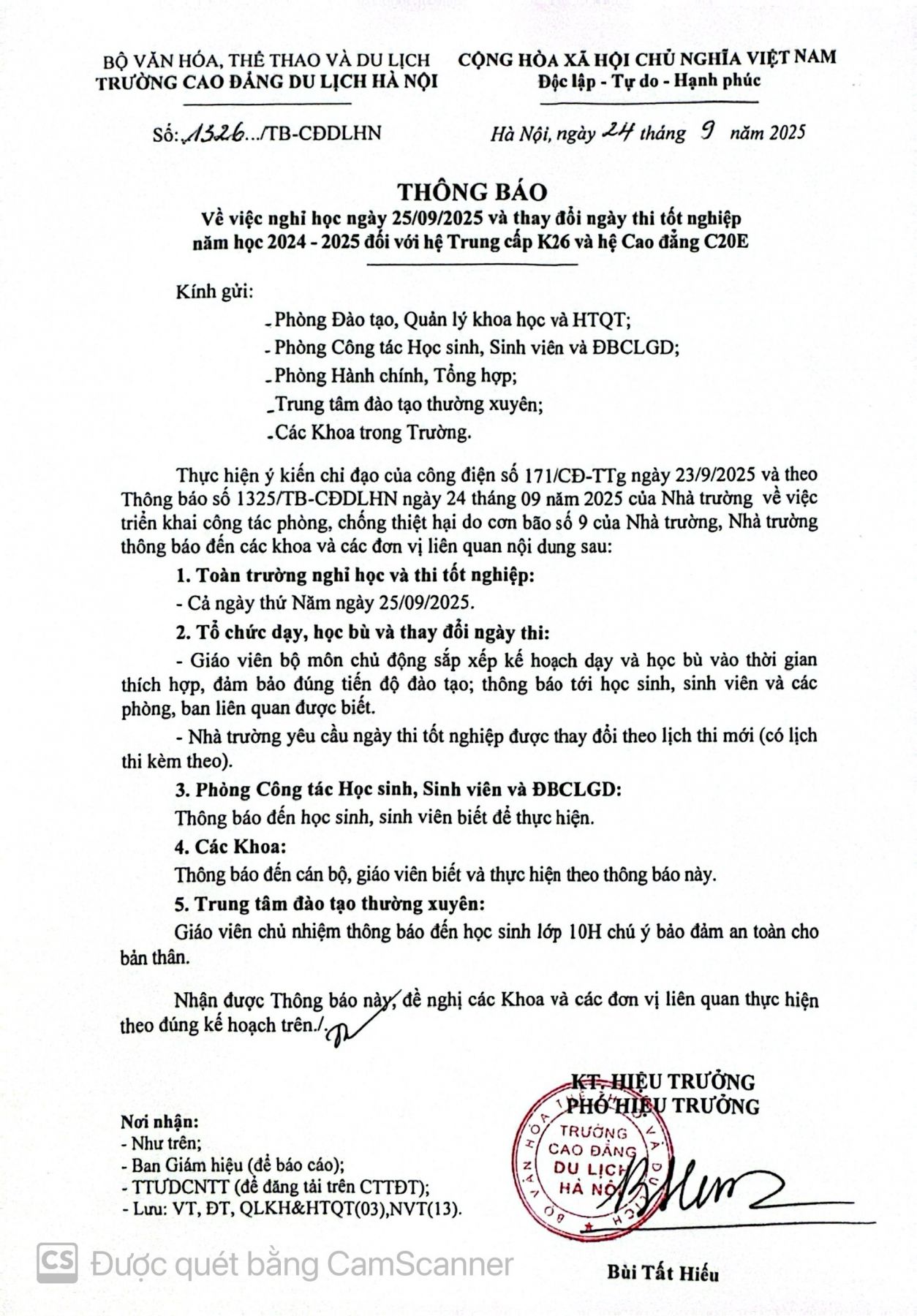Thông báo số 1326/TB-CĐDLHN ngày 24/9/2025 V/v nghỉ học ngày 25/9/2025 và thay đổi ngày thi tốt nghiệp năm học 2024 - 2025 đối với hệ Trung cấp K26 và hệ Cao đẳng C20E