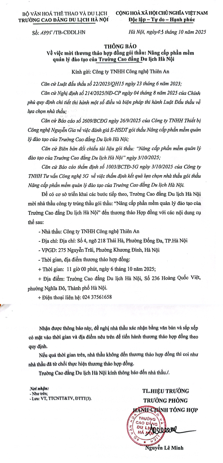 Thông báo v/v mời thương thảo hợp đồng gói thầu "Nâng cấp phần mềm quản lý đào tạo của Trường CĐ DLHN"