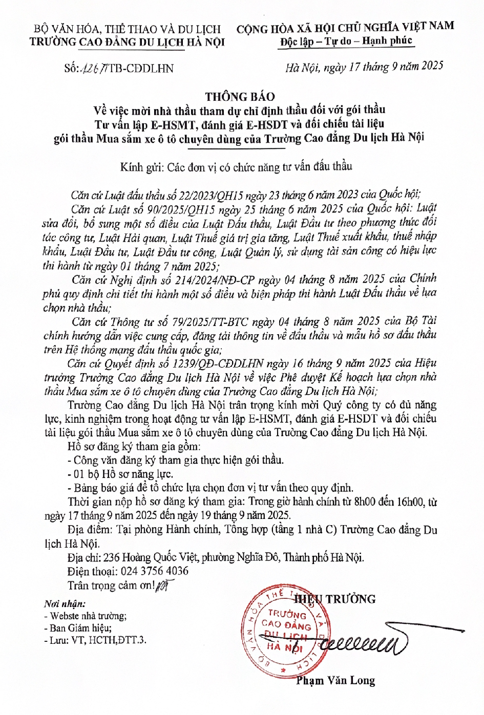 Thông báo mời nhà thầu tham dự chỉ định thầu với gói thầu tư vấn lập E-HSMT, đánh giá E-HSDT và đối chiếu tài liệu gói thầu Mua sắm xe ô tô chuyên dùng của Trường